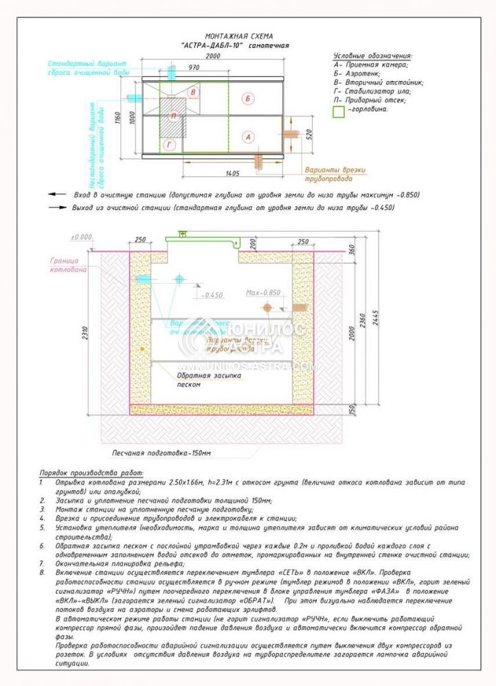 Для начала нужно выкопать котлован по размерам на 20 см больше, чем сама установка Юнилос Астра 10. Далее подготавливается песчаная подушка на его дне. На следующем этапе выполняется копка траншей, прокладка электрического кабеля и подводящей трубы в них, а сама станция опускается на дно, также устанавливается компрессор и подключаются инженерные коммуникации. На следующем этапе септик обсыпается песком с попеременным заполнением водой. Проводятся пусконаладочные работы.