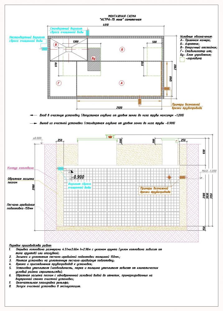Септик Астра 75 long – это автономная канализация, которая использует технологию биологической очистки. Все камеры для очищения стоков расположены внутри конструкции. Он устанавливается под землёй и комплектуется насосом и вентиляционной системой. Септик Астра 75 long состоит из приёмного отсека, аэротенка, отстойника, стабилизатора для ила и устройства для слива воды. Стоки перекачиваются из одной камеры в другую, пока жидкость полностью не очистится.